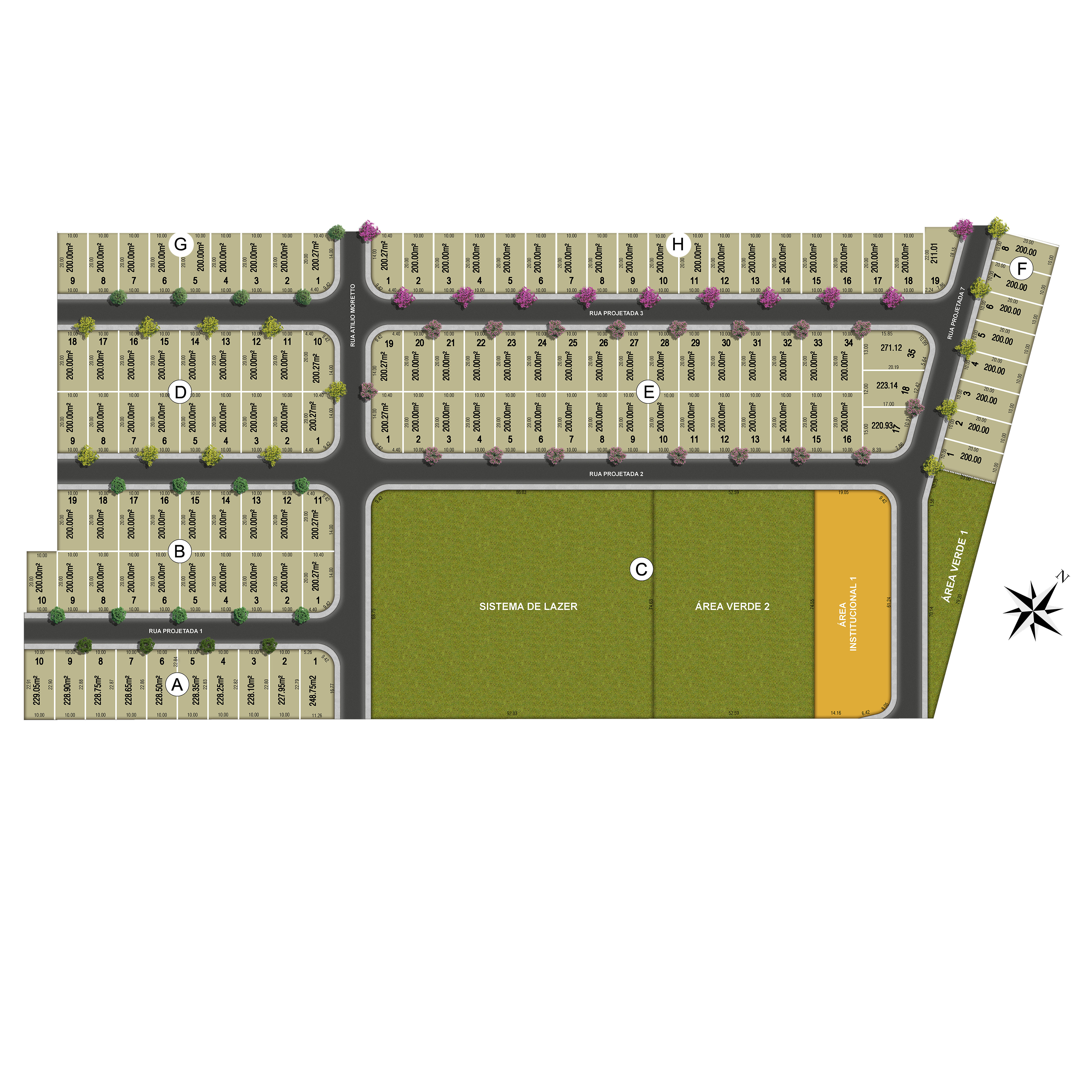 O Residencial Viva Uchoa é um loteamento aberto, possui 296 terrenos entre residenciais e comerciais, com metragens que variam de 200m² a 329m², infraestrutura completa, áreas verdes e institucionais.